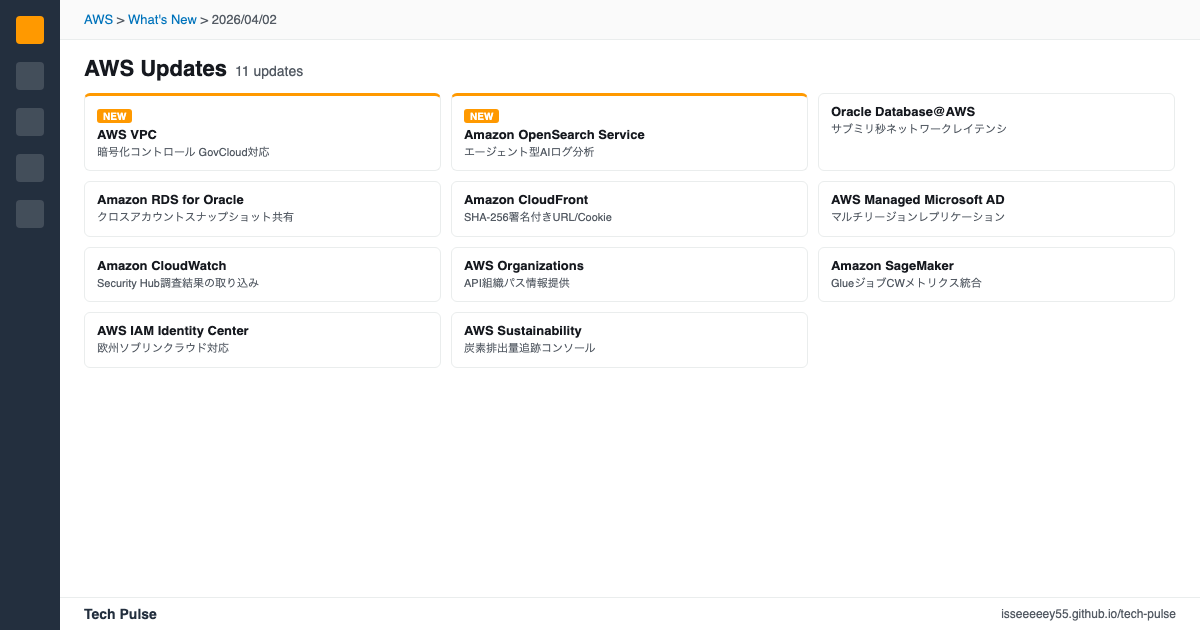2026年4月2日のAWSアップデートは11件です。VPC暗号化コントロールのGovCloud対応とOpenSearch Serviceのエージェント型AIログ分析が目を引きます。CloudFrontのSHA-256署名URLやSustainabilityコンソールなど、セキュリティと運用周りの機能追加が中心です。
