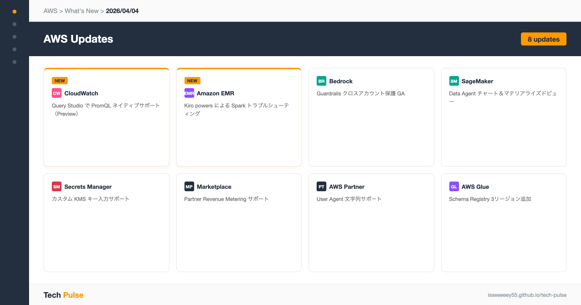 2026年4月4日のAWSアップデートは8件です。CloudWatch Query StudioがPromQLをネイティブサポート(プレビュー)、EMRにKiro powersによるSparkトラブルシューティングエージェントが追加、Bedrock Guardrailsのクロスアカウント保護がGAになりました。監視まわりの統合が進んだ一日です。