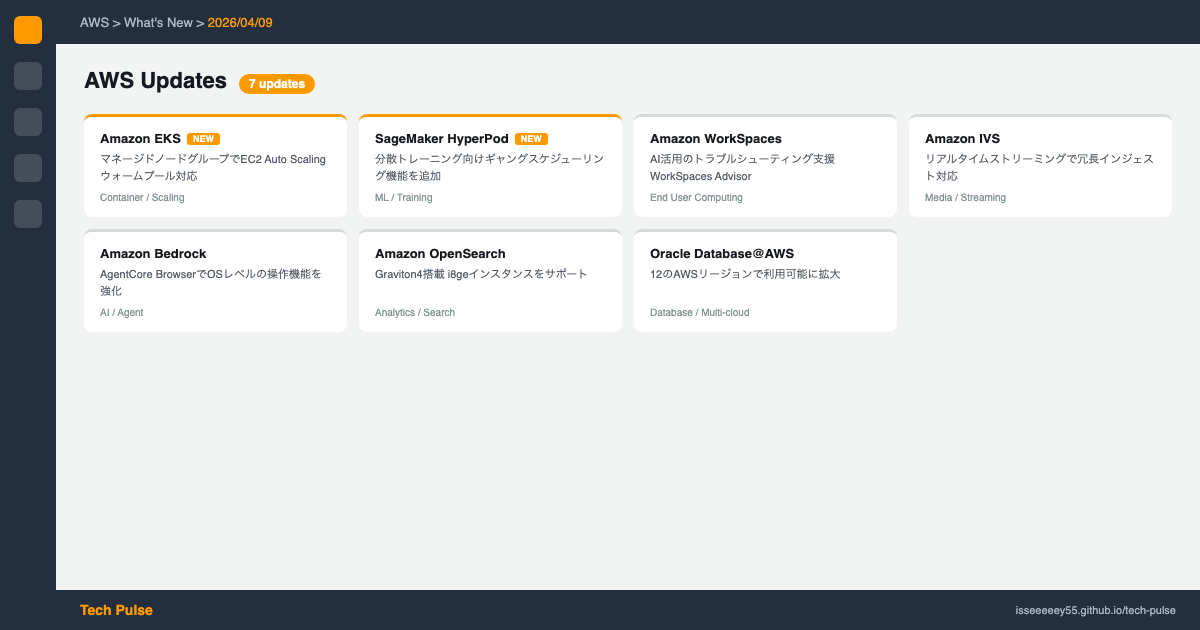 2026年4月9日のAWSアップデートは7件。EKSマネージドノードグループのウォームプール対応と、SageMaker HyperPodのギャングスケジューリングが目玉です。どちらも「待ち時間を減らす」方向のアップデートで、EKSはノード起動の高速化、HyperPodは分散トレーニングのリソース同期にそれぞれ効きます。