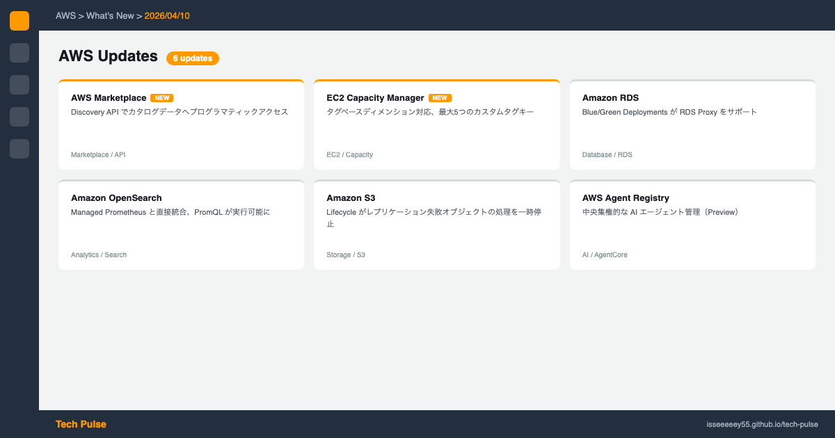 2026年4月10日のAWSアップデートは6件。目玉は AWS Marketplace Discovery API のリリースと、EC2 Capacity Manager のタグベースディメンション対応です。Discovery API はこれまで Web UI でしか取れなかった Marketplace のカタログ情報を API で取れるようになるもの。Capacity Manager のタグ対応は、最大5つのカスタムタグキーを使ってキャパシティを集計できるようになります。