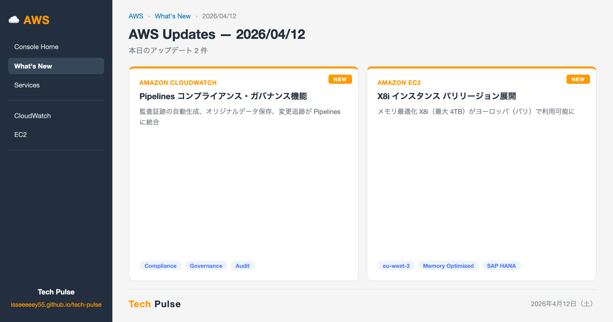 2026年4月12日、AWS から2件のアップデートがリリースされました。メモリ最適化インスタンス X8i の欧州リージョン拡大と、CloudWatch Pipelines の新たなコンプライアンス機能の追加です。CloudWatch Pipelines のガバナンス強化は、規制業界でのログ運用を楽にしてくれそうです。