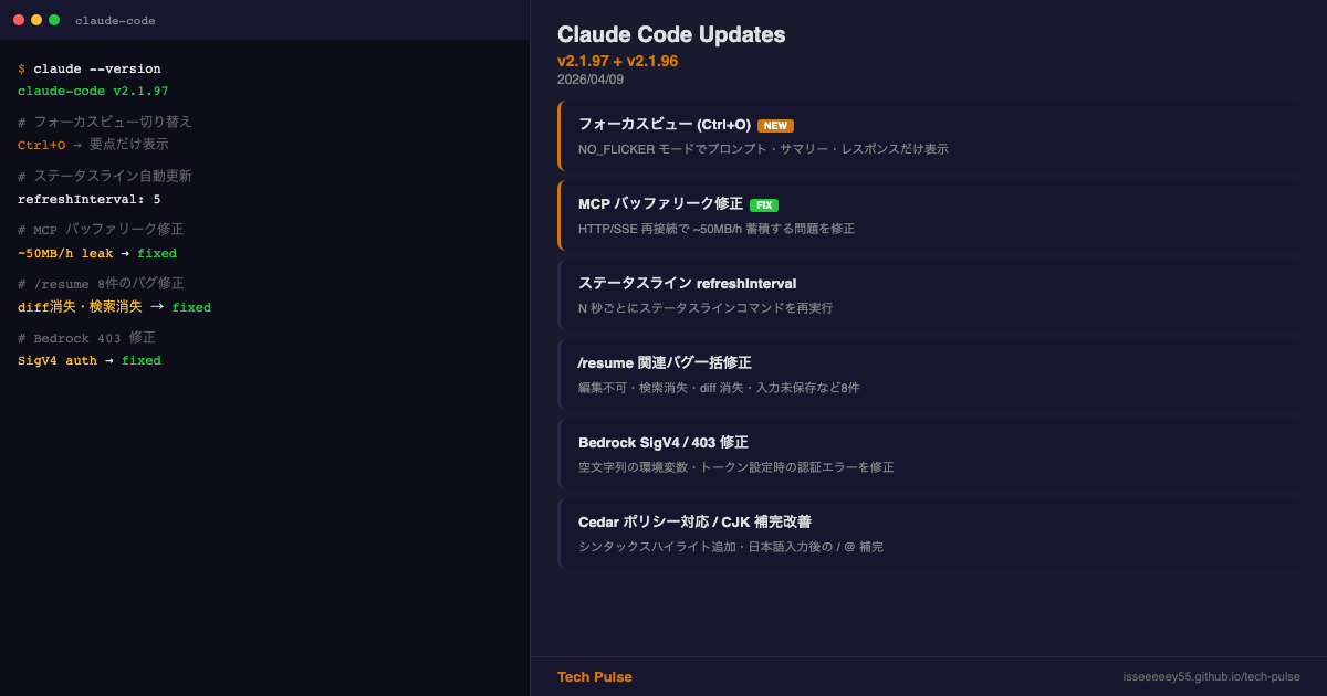 v2.1.97 は Fix が中心で、特に /resume と NO_FLICKER の安定性が上がっています。MCP のバッファリーク修正は長時間セッションで確実に効くので、MCP を多用しているなら早めにアップデートしておきましょう。Bedrock を CI/CD で使っている場合は v2.1.96 → v2.1.97 の両方を適用してください。